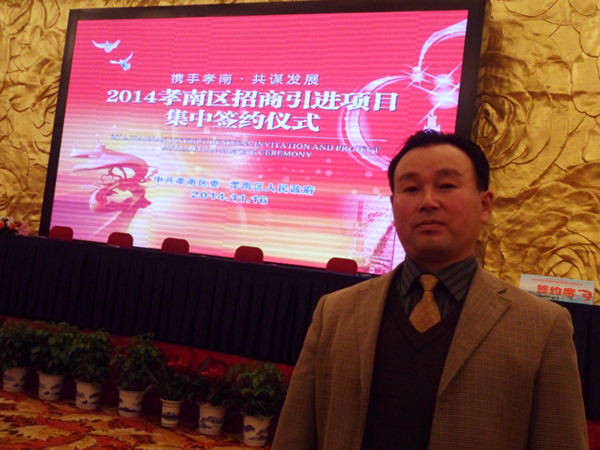 左四為闊??偨?jīng)理,正在主席臺簽約,身后為孝南區(qū)委書記楊軍安,區(qū)長劉剛
