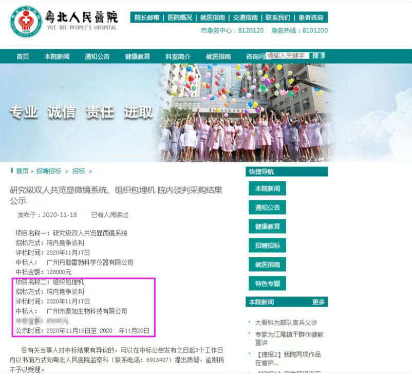 闊海組織包埋機(jī)中標(biāo)粵北人民醫(yī)院