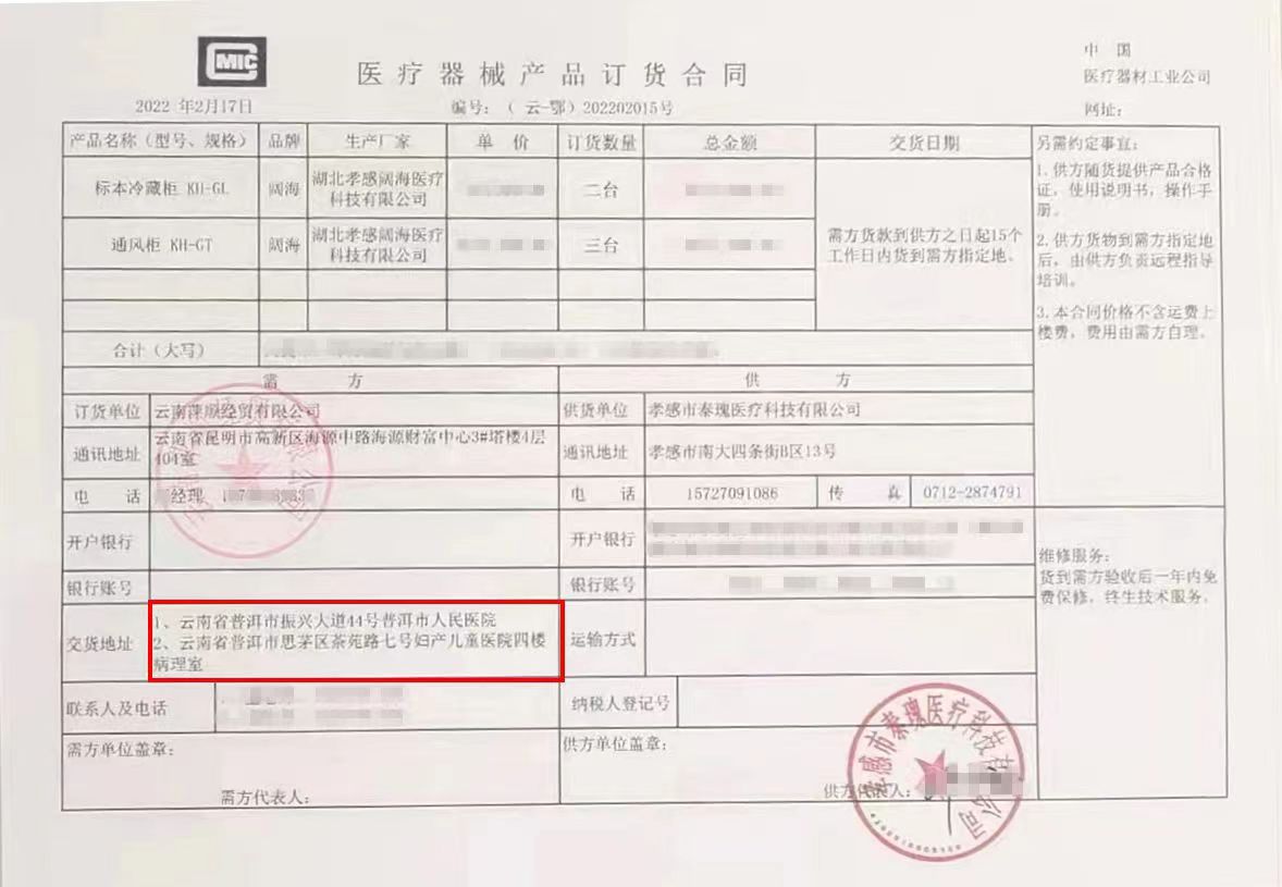 云南普洱市人民醫(yī)院、普洱市婦女兒童醫(yī)院共采購(gòu)5臺(tái)闊海通風(fēng)柜及標(biāo)本冷藏柜