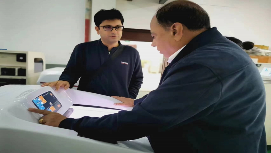 闊海醫(yī)療相關(guān)領(lǐng)導(dǎo)(右)為印度客戶講解生物組織切片機(jī)的外觀以及性能