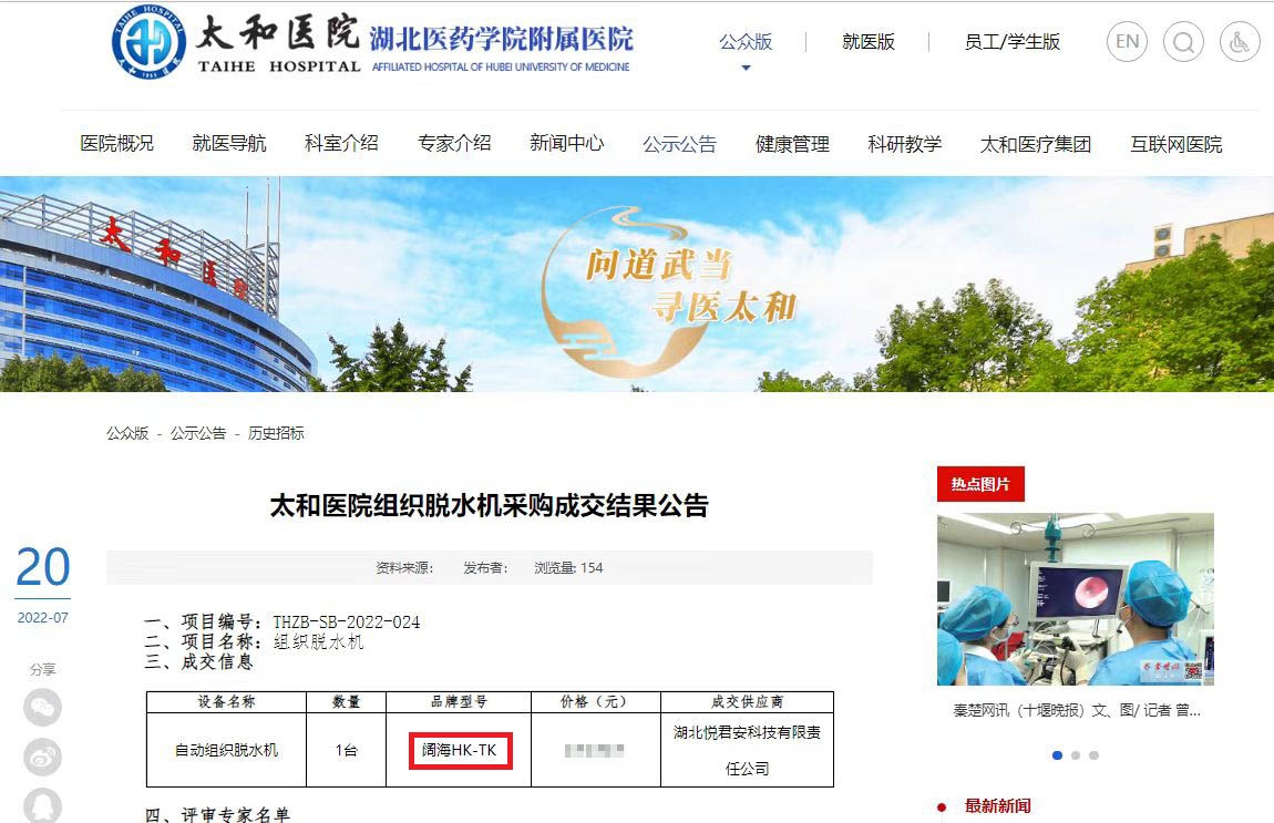 闊海雙吊籃自動(dòng)組織脫水機(jī)中標(biāo)湖北大型三甲醫(yī)院